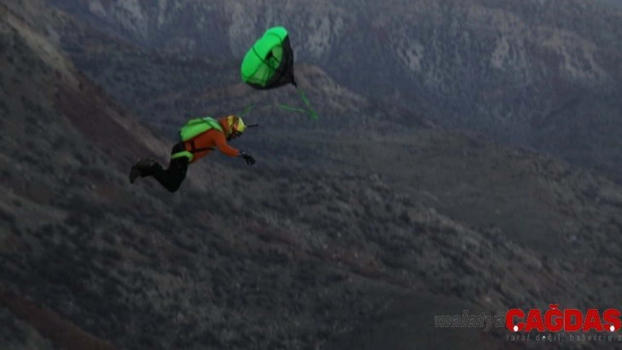 Ekstrem sporcular, Siirt’in Tillo ilçesinde bulunan bin 300 rakımlı Kaletül-Üstad tepesinden paraşütle atladı.
