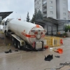 Adana’da sürücüsünün el frenini çekmeyi unuttuğu tanker, yakıt boşaltımı sırasında rampadan düşüp askıda kaldı.