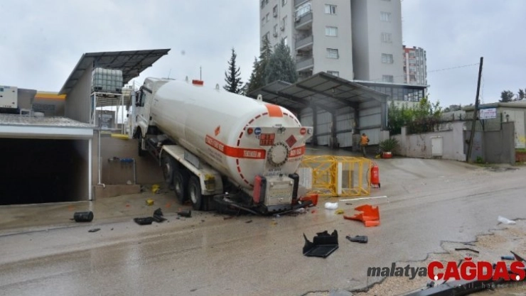 Adana'da sürücüsünün el frenini çekmeyi unuttuğu tanker, yakıt boşaltımı sırasında rampadan düşüp askıda kaldı.