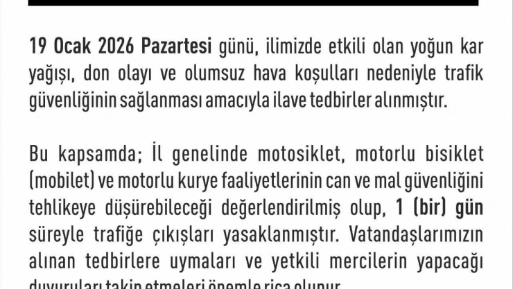 Elazığ Valiliği’nden yapılan açıklamada, "19 Ocak 2026 Pazartesi günü, ilimizde etkili olan yoğun kar yağışı, don olayı ve olumsuz hava koşulları nedeniyle trafik güvenliğinin sağlanması amacıyla ilave tedbirler alınmıştır. Bu kapsamda; İl genelinde motosiklet, motorlu bisiklet (mobilet) ve motorlu kurye faaliyetlerinin can ve mal güvenliğini tehlikeye düşürebileceği değerlendirilmiş olup, 1 (bir) gün süreyle trafiğe çıkışları yasaklanmıştır. Vatandaşlarımızın alınan tedbirlere uymaları ve yetkili mercilerin yapacağı duyuruları takip etmeleri önemle rica olunur" denildi.