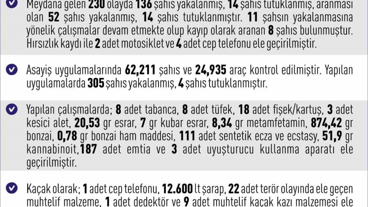 Yapılan çalışmalarda; 8 adet tabanca, 8 adet tüfek, 18 adet fişek/kartuş, 3 adet kesici alet, 20,53 gram esrar, 7 gram kubar esrar, 8,34 gram metamfetamin, 874,42 gram bonzai, 0,78 gram bonzai ham maddesi, 111 adet sentetik ecza ve ecstasy, 51,9 gram kannabinoit, 187 adet emtia ve 3 adet uyuşturucu kullanma aparatı, kaçak olarak ise 1 adet cep telefonu, 12.600 litre şarap, 22 adet terör olayında ele geçen muhtelif malzeme, 1 adet dedektör ve 9 adet muhtelif kaçak kazı malzemesi ele geçirildiği bildirildi.