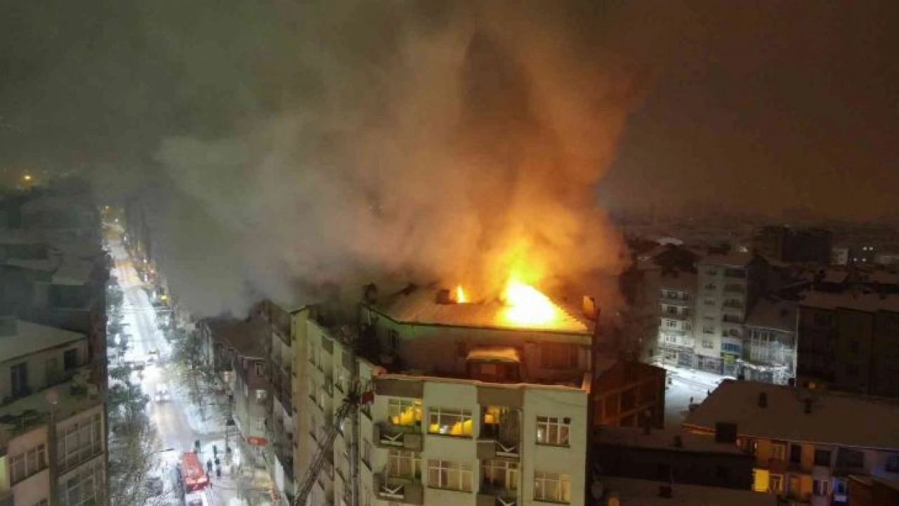 Elazığ’da 6 katlı bir binanın çatı katında yangın çıktı. Alevler 3 binanın daha çatısına sıçrarken ekiplerin yangına müdahalesi sürüyor.