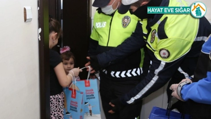 Elazığ'da trafik haftası kapsamında polisler, farkındalık oluşturmak için evleri ziyaret etti çocuklara kapı önünde soru cevaplı hatırlatıcı eğitim vererek hediyelerle mutlu etti.