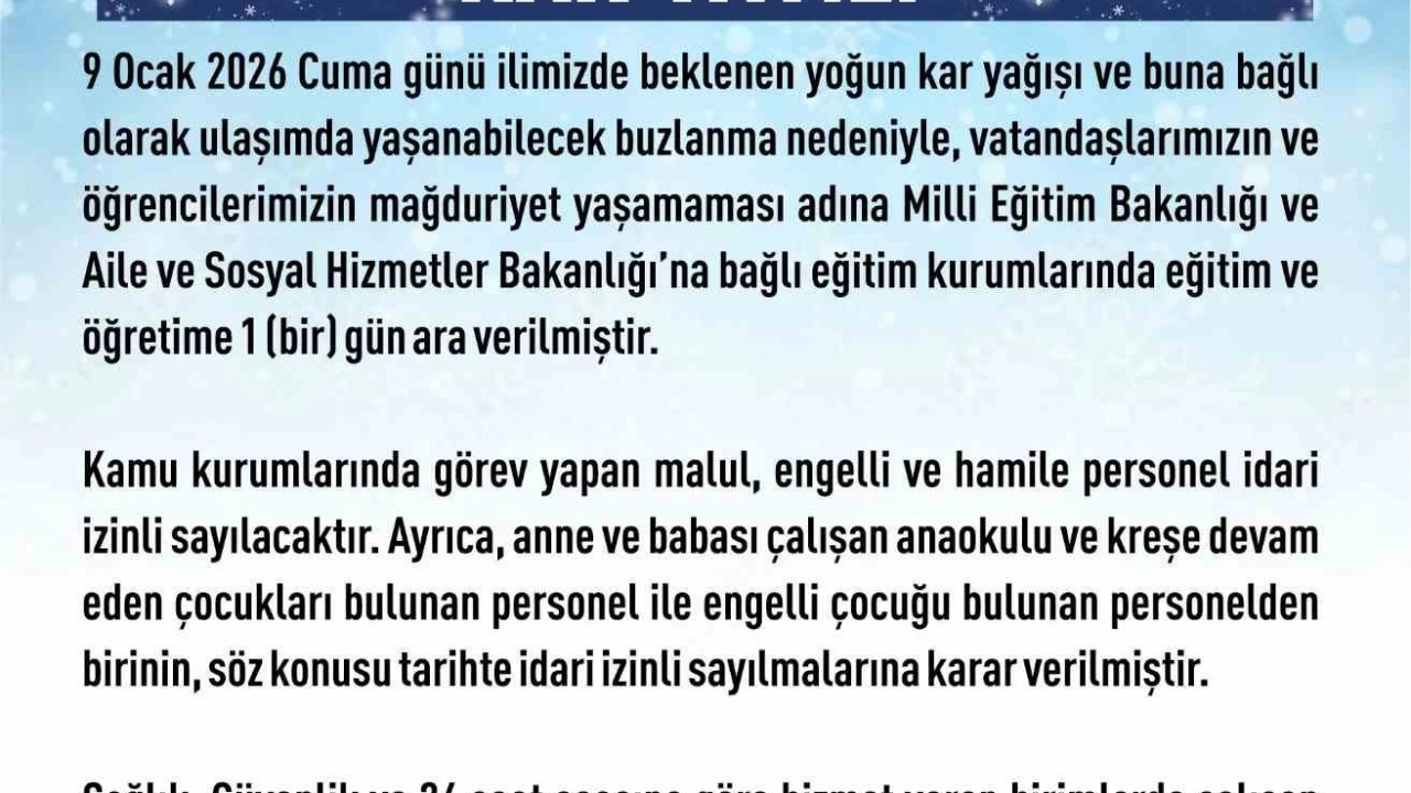 Elazığ Valiliğinden yapılan açıklamada, "9 Ocak 2026 Cuma günü ilimizde beklenen yoğun kar yağışı ve buna bağlı olarak ulaşımda yaşanabilecek buzlanma nedeniyle, vatandaşlarımızın ve öğrencilerimizin mağduriyet yaşamaması adına Milli Eğitim Bakanlığı ve Aile ve Sosyal Hizmetler Bakanlığı’na bağlı eğitim kurumlarında eğitim ve öğretime 1 gün ara verilmiştir. Kamu kurumlarında görev yapan malul, engelli ve hamile personel idari izinli sayılacaktır. Ayrıca, anne ve babası çalışan anaokulu ve kreşe devam eden çocukları bulunan personel ile engelli çocuğu bulunan personelden birinin, söz konusu tarihte idari izinli sayılmalarına karar verilmiştir. Ayrıca, sağlık, güvenlik ve 24 saat esasına göre hizmet veren birimlerde çalışan personellerin durumu hizmetin gereği olarak ilgili birimler tarafından değerlendirilecektir" ifadelerine yer verildi.