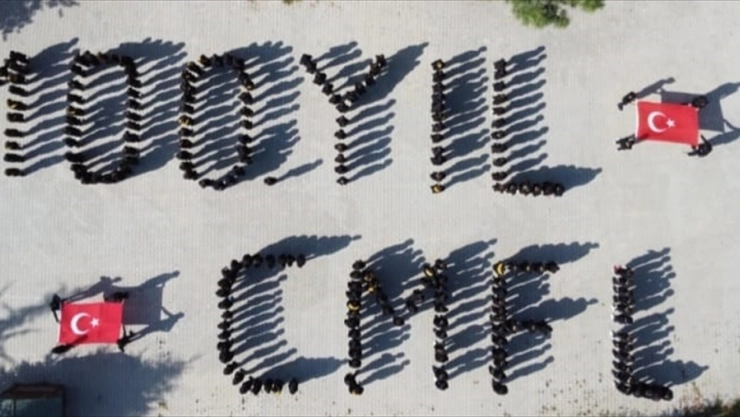 Öğrenciler, okul bahçesinde toplanarak "100. yıl" yazısı oluşturdu.