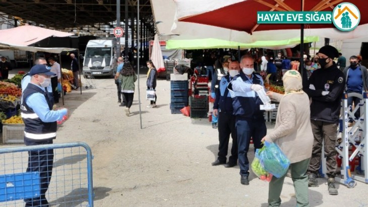 Belediyeden yapılan açıklamada," Korona virüs tedbirleri kapsamında hijyen ve dezenfeksiyon çalışmaları, vatandaşları bilinçlendirme ve sosyal mesafeye uyumluluk sağlanması noktasında kararlı çalışmasını sürdüren belediyemiz, vatandaşların sağlığını korumak amacıyla semt pazarlarında da denetimlerine devam ediyor. Bugün kurulan Perşembe Pazarı girişinde vatandaşları maske kullanımı noktasında uyaran ekiplerimiz, maskesiz vatandaşlara da ücretsiz maske dağıttı"denildi.