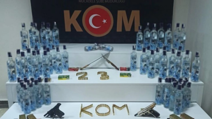 Depoda yapılan aramada, 64 adet sahte bandrollü içki, 1 adet ruhsatsız tabanca, 1 adet kurusıkı tabanca, 546 adet tabancalara ait fişek, 2 adet 6136 SKM bıçak ele geçirildi.