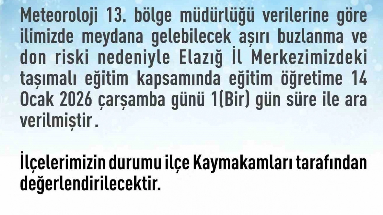 Elazığ Valiliği’nden yapılan açıklamada, "Meteoroloji 13. Bölge Müdürlüğü verilerine göre ilimizde meydana gelebilecek aşırı buzlanma ve don riski nedeniyle Elazığ il merkezimizdeki taşımalı eğitim kapsamında eğitim-öğretime 14 Ocak 2026 Çarşamba günü bir gün süre ile ara verilmiştir" denildi.