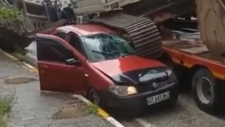 Kaza, Elazığ’ın Alakacaya ilçesinde meydana geldi. Edinilen bilgiye göre, sürücüsünün direksiyon hakimiyeti kaybetmesi sonucu tırın üzerinde bulunan iş makinesi, park halindeki 23 AAS 641 plakalı otomobilin üstüne düştü. Kazada araçta kimsenin olmaması büyük bir felaketi önlerken araçta maddi hasar meydana geldi.
