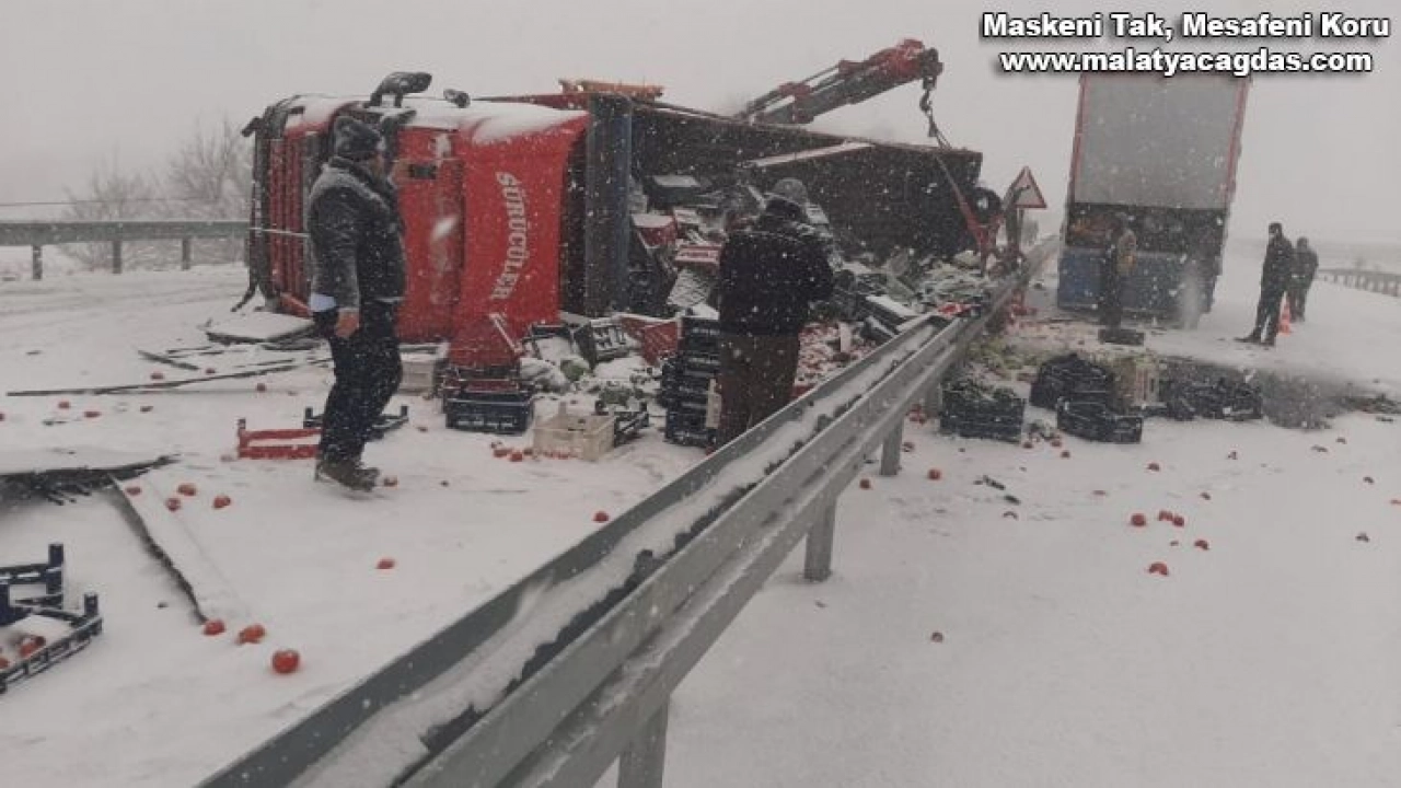 Kar yağışı ve buzlanmanın etkili olduğu Elazığ-Bingöl karayolunda önündeki tıra çarpan sebze ve meyve yüklü tır devrildi, kazada 3 kişi yaralandı. Sebze ve meyvelerin yola saçıldığı kazada kötü hava şartlar nedeniyle trafik 2 saat süre ile ulaşıma kapatıldı, uzun araç kuyrukları oluştu.