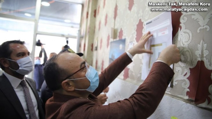 Covid-19 denetimlerine katılan Elazığ Valisi Erkaya Yırık, 3-4 gündür vaka sayılarında tedrici artışın olduğuna dikkat çekerek vatandaşları maske, hijyen ve mesafe konusunda uyardı, iş yerlerine de uyarı afişlerini astı.