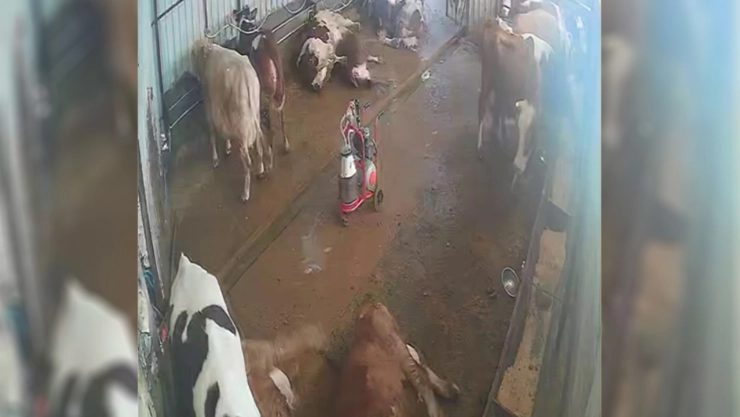 O anda hayvanları yemlemeye çalışan çocukları ve yeğenleri can havliyle kendilerini dışarı attı. Hayvanların akıma kapılması ve yemleme için ahırda bulunanların can havliyle kendilerini dışarıya atmaları, beside bulunan güvenlik kamerasına an be an yansıdı.