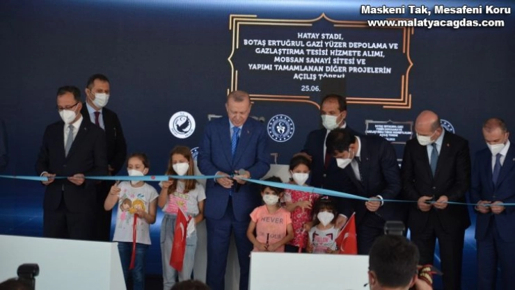Cumhurbaşkanı Erdoğan, Hatay Stadı, BOTAŞ Ertuğrul Gazi Yüzer Depolama ve Gazlaştırma Tesisi Hizmete Alımı, MOBSAN Sanayi Sitesi ve yapımı tamamlanan diğer projelerin açılış törenine katıldı.