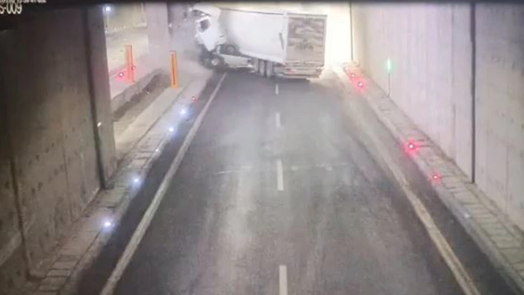 Görüntülerde tırın kontrolden çıkarak hızla tünel duvarına çarptığı ve kafa kısmı dorseden ayrılarak hurdaya döndüğü görülüyor.