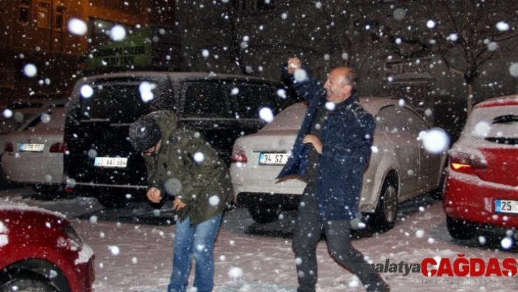 Erzurum'da akşam saatlerinde başlayan kar yağışı kenti beyaza bürüdü. Kar yağışının tadını çıkartan vatandaşlar renkli görüntüler oluşturdu.