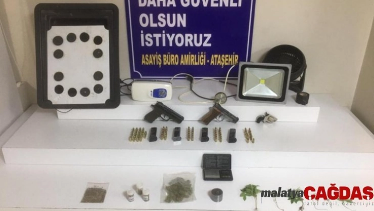Eve yapılan operasyonda, 2 adet ruhsatsız tabanca, bu tabancalara ait 2 adet şarjör, 2 adet yedek şarjör ve 46 adet fişek, 1 adet toplu suikast tabancası ve bu silaha ait 4 adet fişek, 7 kök 7,5 gr. ağırlığında Hint keneviri, 1 adet ot öğütücüsü, 3 adet cam kutu içerisinde toplam ağırlığı 43,2 gram gelen Hint keneviri tohumu, 1 adet hassas terazi, 1 adet şeffaf poşet içinde 21 gram gelen marihuana, uyuşturucu yetiştirmeye yarayan çok sayıda malzeme ele geçirildi.