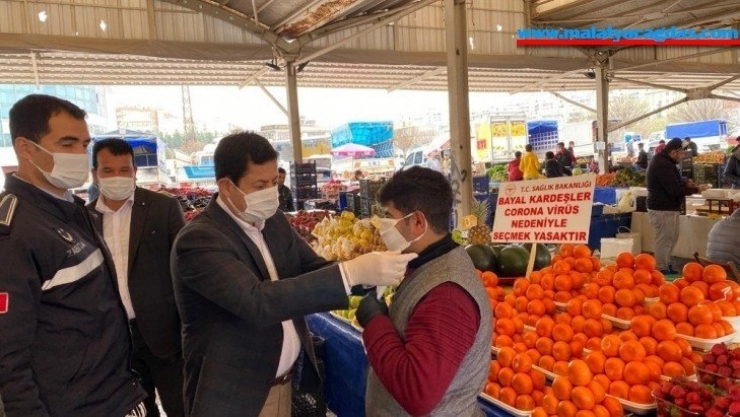 Eyyübiye Belediyesi, korona virüs (Covid-19) salgınına karşı korunma tedbirleri kapsamında ilçe genelindeki semt pazarlarına maske ve eldiven dağıtımını sürdürüyor.