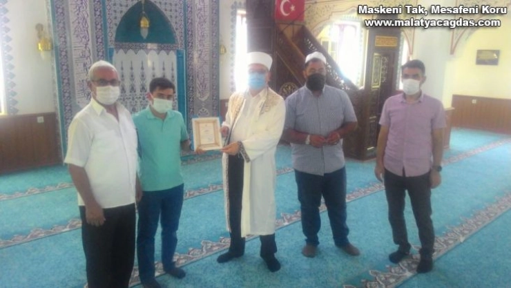 Yeşilyurt İlçesi Müftüsü Mehmet Şirin Ayral, Cuma namazı sonrasında teşekkür belgesini Reşadiye Cami imamı Fatih Polat’a takdim etti.