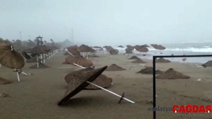 Antalya'da fırtına nedeniyle denizde oluşan dalgalar, sahilde bulunan piramit hasır şemsiyeleri yerinden etti, bazı ağaçlar kökünden söküldü.