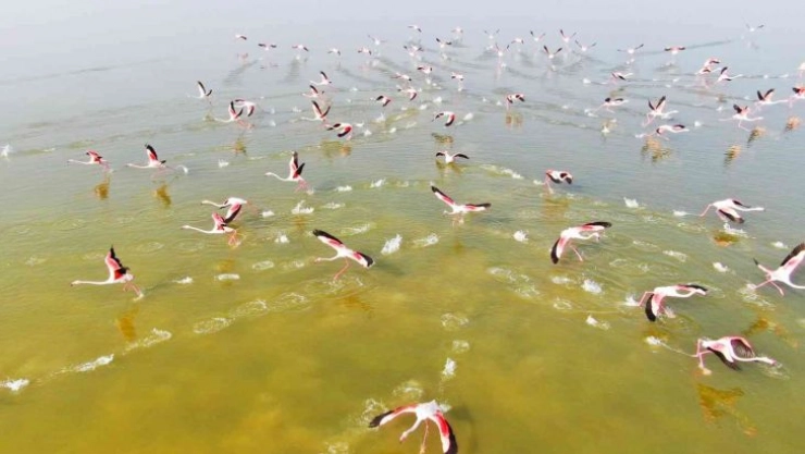 Adana’nın Karataş ilçesinde bulunan Akyatan Lagünü’nde konaklayan flamingolar görsel şölen sunuyor.