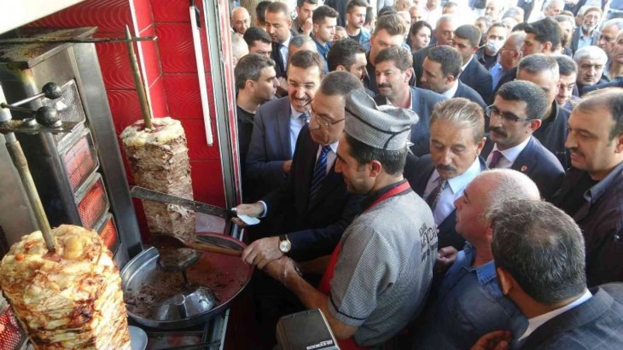 '2023'e Doğru Şehir Buluşmaları' programı çerçevesinde Malatya'ya gelen Cumhurbaşkanı Yardımcısı Fuat Oktay, kent merkezinde gerçekleştirdiği esnaf ziyareti sırasında döner ustasının teklifini geri çevirmeyerek eline aldığı döner bıçağı ile döner kesti.