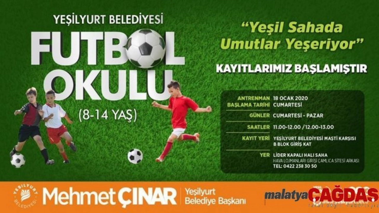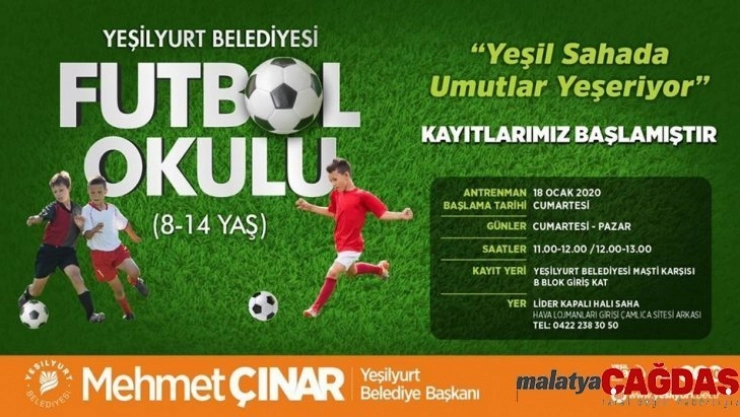 Malatya Yeşilyurt Belediye Gençlik ve Spor Hizmetleri Müdürlüğü bünyesinde, 8 ile 14 yaş aralığındaki çocuklara yönelik 'Yeşil Sahada Umutlar Yeşeriyor' sloganıyla açılacak olan Futbol Okulunun kayıtları başladı.