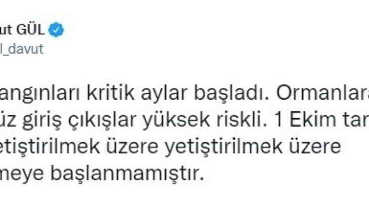 Gaziantep Büyükşehir Belediyesi, Valilik ve Orman İşletme Müdürlüğü iş birliğinde 180 orman köyüne yangınla mücadele ve önlemeye yönelik malzeme dağıtımının yapıldığı Gaziantep’te, Vali Davut Gül’den orman yangınlarına karşı kritik bir uyarı geldi. Vali Gül uyarıda bazı ormanlık alanlarda piknik yapmanın yasaklandığını duyurulurken, "Orman yangınları açısından kritik aylar başladı. Ormanlara kontrolsüz giriş çıkışlar yüksek risk oluşturuyor. 1 Ekim tarihine kadar, düzenli piknik alanlarının dışındaki orman alanlarına girmek, piknik yapmak yasaklanmıştır’’ ifadelerine yer verildi.