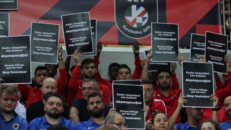 2019 Kadınlar Voleybol Avrupa Şampiyonası mücadelesi olan Türkiye-Yunanistan maçını tribünden izleyen Gençlerbirliği futbolcuları, “Kadın cinayetleri son bulsun! Alışmayacağız!” dövizleri ile tepki gösterdi.
