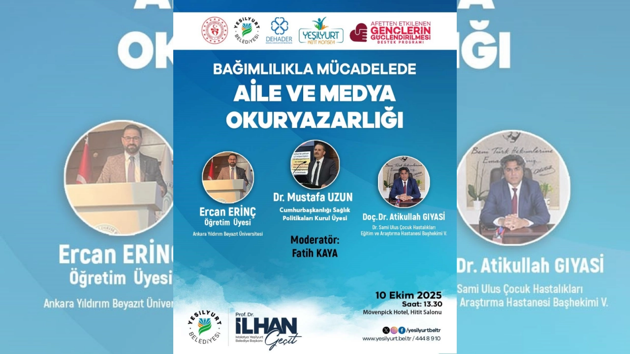 Yeşilyurt Belediyesi ve Yeşilyurt Kent Konseyi, gençlerin kişisel gelişimine katkı sunmak ve toplumsal farkındalık oluşturmak amacıyla 10 Ekim Cuma günü saat 13:30’da “Bağımlılıkla Mücadelede Aile ve Medya Okuryazarlığı” paneli düzenleyecek. Panele, Cumhurbaşkanlığı Sağlık Politikaları Kurul Üyesi Dr. Mustafa Uzun başta olmak üzere alanında deneyimli isimler katılacak.