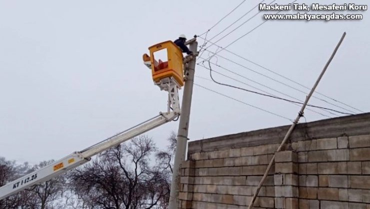 Adıyaman'ın Gölbaşı ilçesinde etkili olan kar yağışı nedeniyle devrilen elektrik direkleri tek tek onarılıyor.