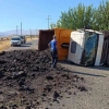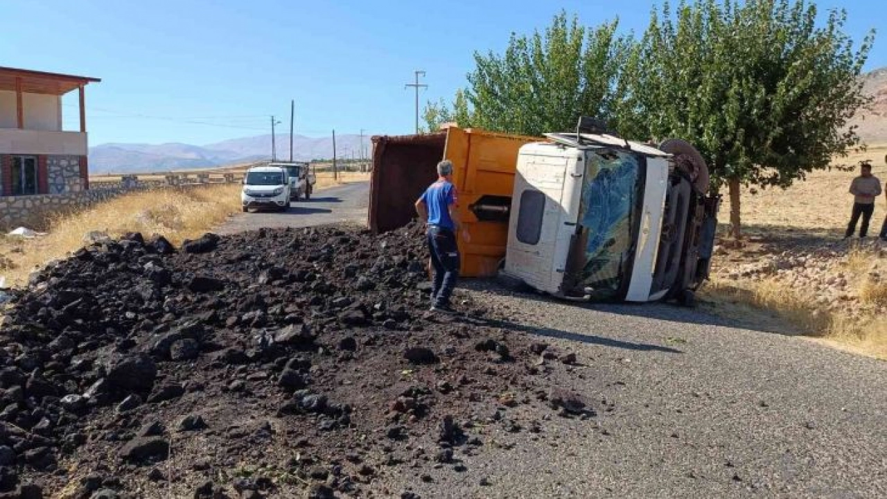 Adıyaman'da, hafriyat yüklü kamyon sürücüsünün direksiyon hakimiyetini kaybetmesi sonucu devrildi.