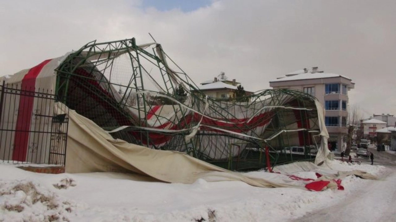 Malatya'nın Doğanşehir ilçesinde kar kütlesinin ağırlığına dayanamayan halı sahasının çatısı çöktü. Çatısı çöken halı sahada maç oynama hazırlığı yapıldığı, vatandaşlar halı sahaya girmeden hemen önce çatının çöktüğü ve muhtemel büyük bir facianın eşiğinden dönüldüğü ortaya çıktı.