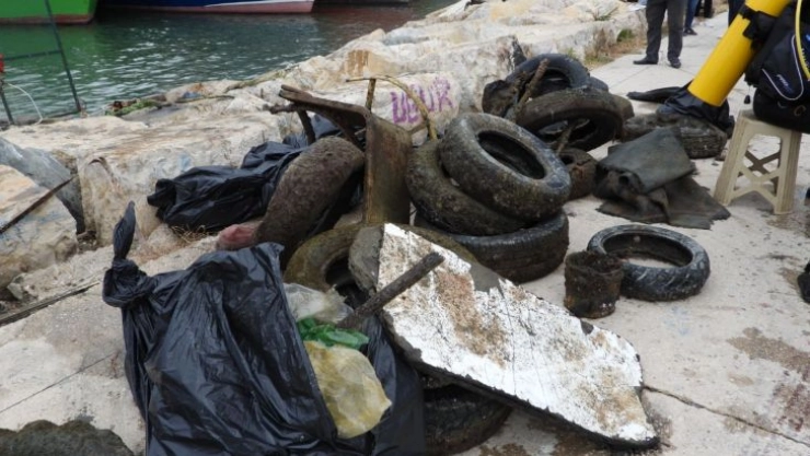 Hatay'ın Samandağ ilçesinde denizde yapılan dip temizliğinde sandalye ve araba lastikleri çıktı.