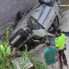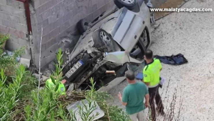 Hatay'ın Samandağ ilçesinde bir evin bahçesine düşerek devrilen otomobildeki 3 kişi yaralandı.