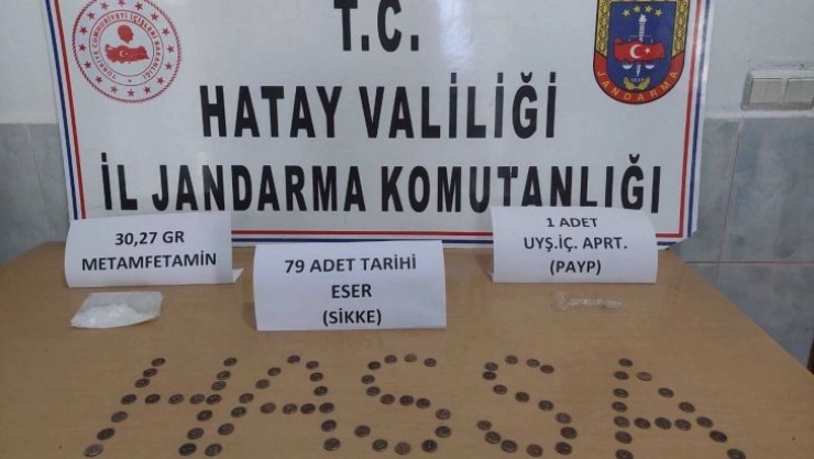 Kaçakçılıkla Mücadele Şube Müdürlüğü ile Hassa İlçe Jandarma Komutanlığı ve Jandarma Dedektifleri (JASAT) tarafından takibe alınan otomobil Akbez Mahallesi’nde durduruldu. Otomobilde yapılan aramada; 30.27 gram uyuşturucu madde olduğu değerlendirilen metamfetamin, 5 adet uyuşturucu hap, 2 adet Payp diye tabir edilen uyuşturucu madde içme aparatı ile 79 adet tarihi eser olduğu değerlendirilen obje ele geçirildi.