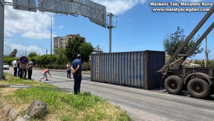 Hatay’ın Payas ilçesinde seyir halindeki tırın açılan dorsesi karayollarına ait levhalara çarptı. Üzerinde bulunan konteyner yola düştü, elektrik tellerinin kopmasına neden oldu.