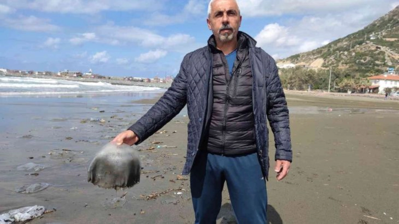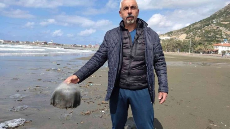 Hatay'ın Samandağ ilçesinde yüzlerce ölü denizanası sahile vurdu.