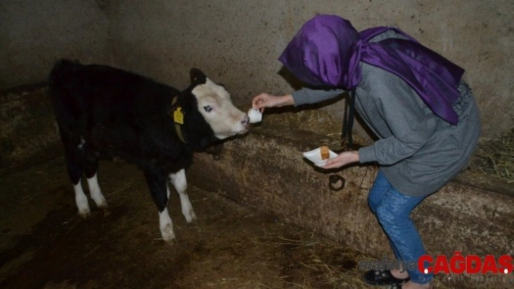 Büyükbaş hayvanları da olan Seda Özbek onlara kahve ikram ediyor.