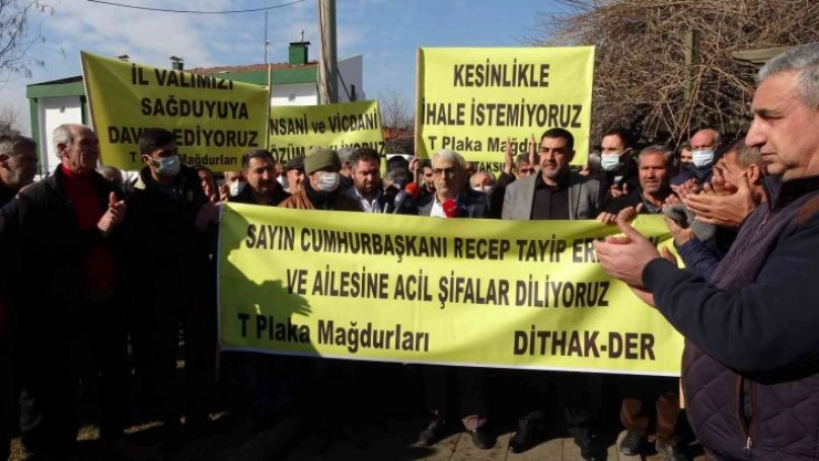 HDP’li belediyenin mağdur ettiği Diyarbakır T Plaka Hak Sahipleri Yardımlaşma ve Dayanışma Derneği DİTHAKDER, Cumhurbaşkanı Recep Tayyip Erdoğan ve eşine geçmiş olsun pankartları açtı, T plaklarıyla ilgili açıklama yaptı. DİTHAKDER Başkanı Ahmet Arslan ve taksicilerin katıldığı açıklamada Dernek Başkan Yardımcısı Hasan Nadiroğlu,13 yıldır mağduriyet yaşadıklarını söyledi. 2011 yılında bedelini ödeyerek, herkesin uymak zorunda olduğu yasaların ilgili maddelerinin Büyükşehir Belediyesine verdiği yetki çerçevesinde 914 ticari taksi plakası aldıklarını anımsatan Nadiroğlu, “Ancak samimiyetle belirtmek isteriz ki, o gündür bu gündür biz ve çocuklarımızın hayatı allak bullak oldu. Bir diğer deyimle hem evimize ekmek götüremedik hem de yapılan keyfi uygulamalar karşısında intihar derecesine geldik. Trafik tescil belgemiz, ödediğimiz bedel ve adımıza tahsisi yapılan plakalarımızın adeta gasp edilerek, işlevsiz bırakılmasından sonra yargıya başvurduk ve kazandık. Mahkeme kararından sonra belediye ‘Şehrin gelişimine paralel olarak 10 yıl sonra aktifleştirilecektir’ kararı aldı. Aldı ancak, belirlenen zaman ve çok büyük ihtiyaç olarak belli olan ticari taksi gerekliliği kötü niyetli ve haksız planlarla bir türlü bize teslim edilmedi. Diyarbakır T Plaka Hak Sahipleri Yardımlaşma ve Dayanışma Derneği çatısı altında birleştik ve valimizden defalarca randevu istedik, eğer randevu alsaydık bu konuda valimizin çok iyi niyetine rağmen kendisini yanıltanlara fırsat olmayacaktı. İlk kayyum Cumali Atilla şehir master planı yapmak sureti ile plakalarımızı aktifleştirecekken, seçim süreci başladı. Akabinde seçimden sonra kayyum olarak atanan Hasan Basri Güzeloğlu da aynı çalışmayı yapıp bitirdi. Ancak yerine İl Valimiz Münir Karaloğlu geldi. Çabamız ve gündeme getirmemiz karşısında adımıza tescilli ve tahsisli plakalarımızı ihale ile verme kararı aldılar” dedi.