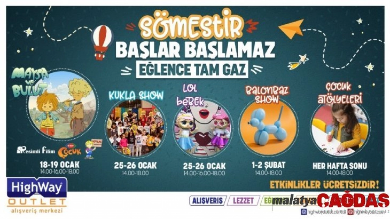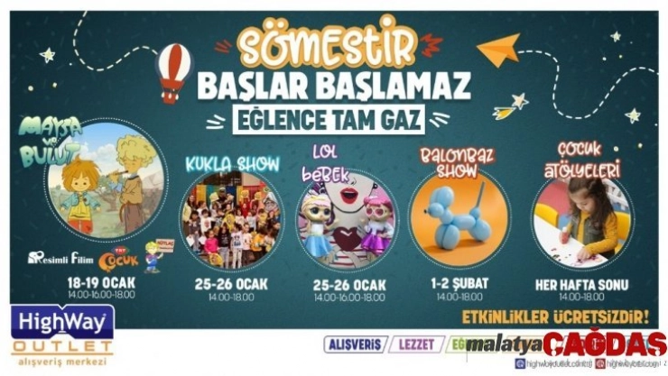 Karnesini alarak 2019-2020 Eğitim ve Öğretim yılının yarıyılını tamamlamanın heyecanını yaşayacak olan çocukları Sömestr tatili boyunca Highway Outlet’te hediyeler, etkinlikler, eğlenceler, Showlar ve yarışmalar bekliyor olacak. Danışma noktasına karnesini getiren çocuklar anında sürpriz hediyelerin sahibi olacaklar. 18 Ocak Cumartesi ve 19 Ocak Pazar günü TRT Çocuk kanalının severek izlenen çizgi filmi Maysa ve Bulut, 14.00-16.00-18.00 saatlerindeki lisanslı gösterisiyle Highway Outlet’te buluşacak. 24 Ocak Cuma günü, Bremen Mızıkacıları Maskotlu Çocuk Oyunu, 25 ve 26 Ocak’ta Kukla Show ve Lol Bebek, 31 Ocak Cuma günü Ormanlar Kralı Aslan, 1 ve 2 Şubat’ta Balonbaz Show gösterisi, aynı zamanda Sömestr tatili boyunca her hafta sonu eğitici ve öğretici çocuk atölyeleri de 14.00-18.00 saatleri arasında minik misafirlerini bekliyor olacak.