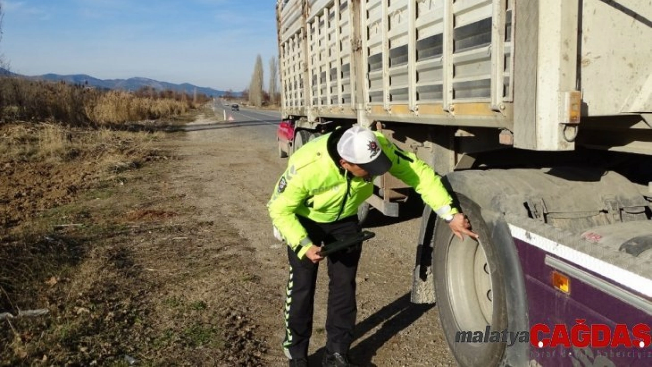 Kütahya'nın Hisarcık ilçesinde şehirlerarası yük ve yolcu taşıyan ticari araçlar için zorunlu kış lastiği uygulaması kapsamında İlçe Emniyet Amirliği Trafik ekiplerince denetimler yapılıyor.