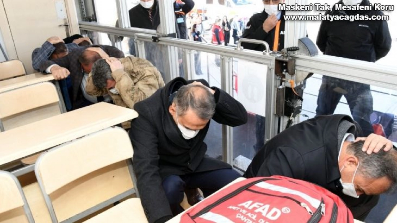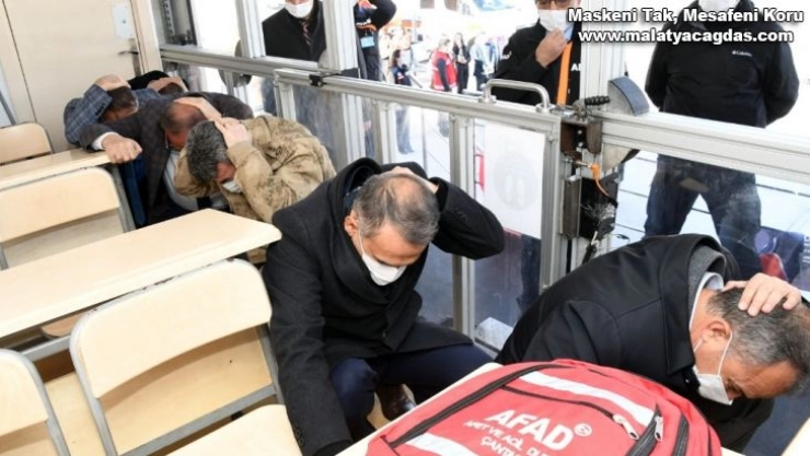 İl protokolü, AFAD görevlilerinden deprem öncesi, deprem sırası ve deprem sonrasında neler yapılması gerektiği ve doğru davranış şekilleriyle ilgili uygulamalı olarak bilgiler aldı.