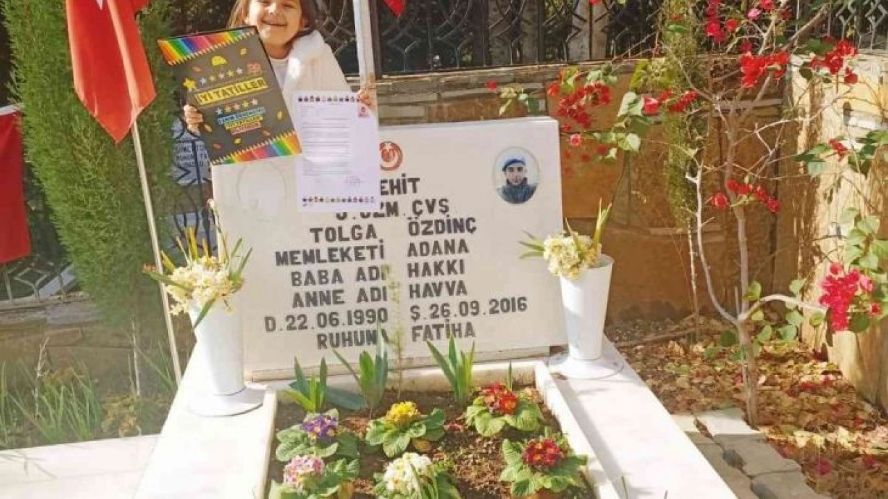27 Eylül 2016’da Şırnak-Van karayolu üzerinde PKK’lı teröristler ile çıkan çatışmada şehit olan Jandarma Uzman Çavuş Tolga Özdinç, geride 17 günlük evli olduğu hamile eşini bıraktı. Funda Özdinç, 9 ay sonra kızı Elif Ennur’u dünyaya getirdi. Bugün kızı 5 yaşında olan Elif Ennur ilk karnesini hiç görmediği babasının mezarına getirdi. Karnesini gösteren Ennur, babasını çok sevdiğini söyledi. Bu anlar mezar başındaki yakınlarını duygulandırdı.