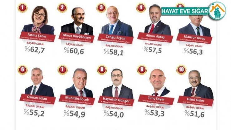 ORC Araştırma, büyükşehir belediye başkanlarının başarısına dair bir çalışma yaptı. Araştırmaya göre en başarılı 10 büyükşehir belediye başkanı arasında ilk sırada Gaziantep Büyükşehir Belediye Başkanı Fatma Şahin yer aldı. Listenin ilk sırasında yer alan Şahin’in başarı oranı yüzde 62,7 oldu. Şahin’in ardından 2. sırada Eskişehir Büyükşehir Belediye Başkanı Yılmaz Büyükerşen 3. Manisa Büyükşehir Belediye Başkanı Cengiz Ergün 4. Bursa Büyükşehir Belediye Başkanı Alinur Aktaş 5. Ankara Büyükşehir Belediye Başkanı Mansur Yavaş 6. Denizli Büyükşehir Belediye Başkanı Osman Zolan 7. Antalya Büyükşehir Belediye Başkanı Muhittin Böcek 8. Kahramanmaraş Büyükşehir Belediye Başkanı Hayrettin Güngör 9. İzmir Büyükşehir Belediye Başkanı Tunç Soyer 10. Ordu Büyükşehir Belediye Başkanı Hilmi Güler yer aldı.