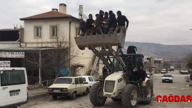 Nevşehir'in Ürgüp ilçesinde seyir halindeki iş makinesinin kepçesinde 7 kişinin tehlikeli yolculuğu objektiflere yansıdı.