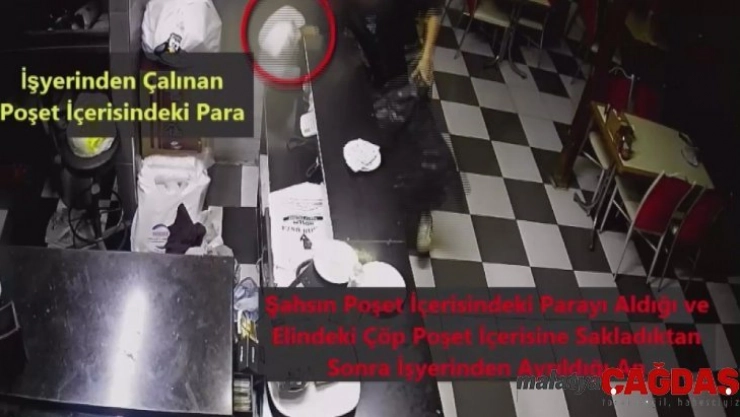 Şüphelinin lokantanın kasası üzerinde duran içi para dolu poşeti alıp lokantadan ayrılması ise güvenlik kameralarınca kaydedildi.