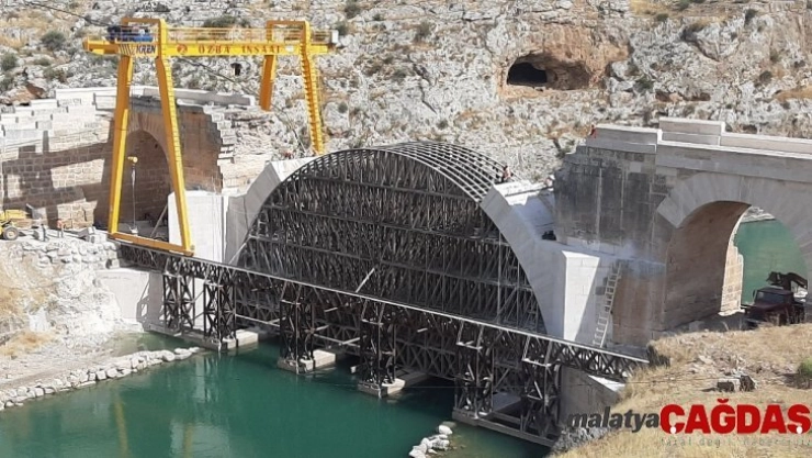 Adıyaman’da restorasyonu devam ederken 400 tonluk demir iskelesi sele kapılan bin 800 yıllık tarihi Kızılin Köprüsü’nde restorasyon kaldığın yerden devam ediyor.