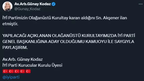 Başarısız sonuçlarla ilgili tartışmalar sürerken İYİ Parti'de ilk aday belli oldu. İYİ Parti Kurucular Kurulu Üyesi Günay Kodaz, sosyal medyadan genel başkanlık için aday olduğunu açıkladı.