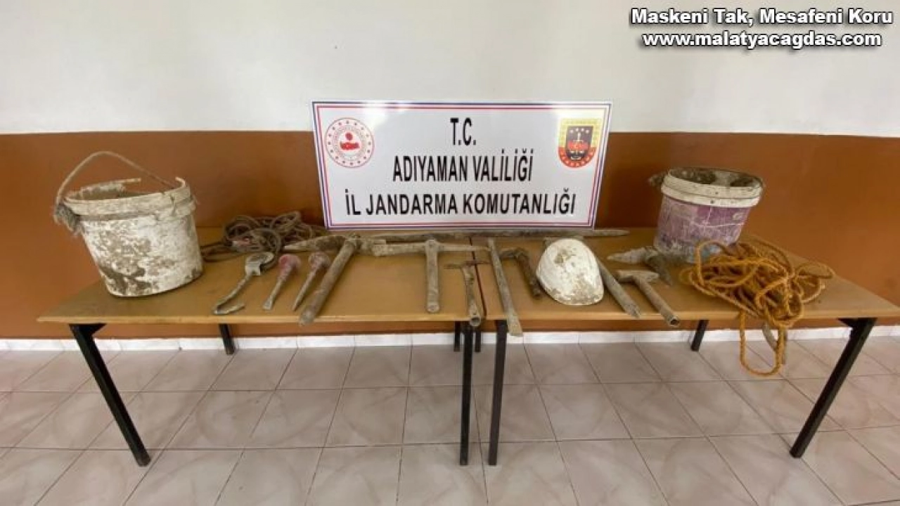 Edinilen bilgilere göre, Adıyaman’ın Tut ilçesine bağlı Yaylımlı Köyünde izinsiz kazı yapan şahısların ihbarını alan jandarma ekipleri kısa sürede harekete geçerek belirtilen bölgeye gitti. Burada kazı yapan M.A., ile A.A., isimli 2 şahsı yakalayarak gözaltına aldı. Jandarma ekipleri aynı zamanda kazı esnasında kullanılan 4 adet kazma, 2 adet demir murç, 1 adet çekiç, 1 adet manivela, 1 adet keser, 1 adet baret, 1 adet tahra, 1 adet kancalı makara, 4 adet kova, 5 metre tahta merdiven, 20 metre halatta ise el koydu.