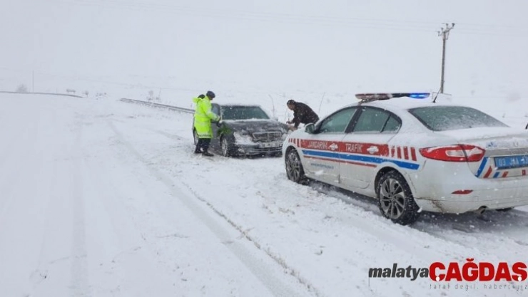 Jandarma ekiplerinden kardan kapanan yollarda mahsur kalan araçlara yardım